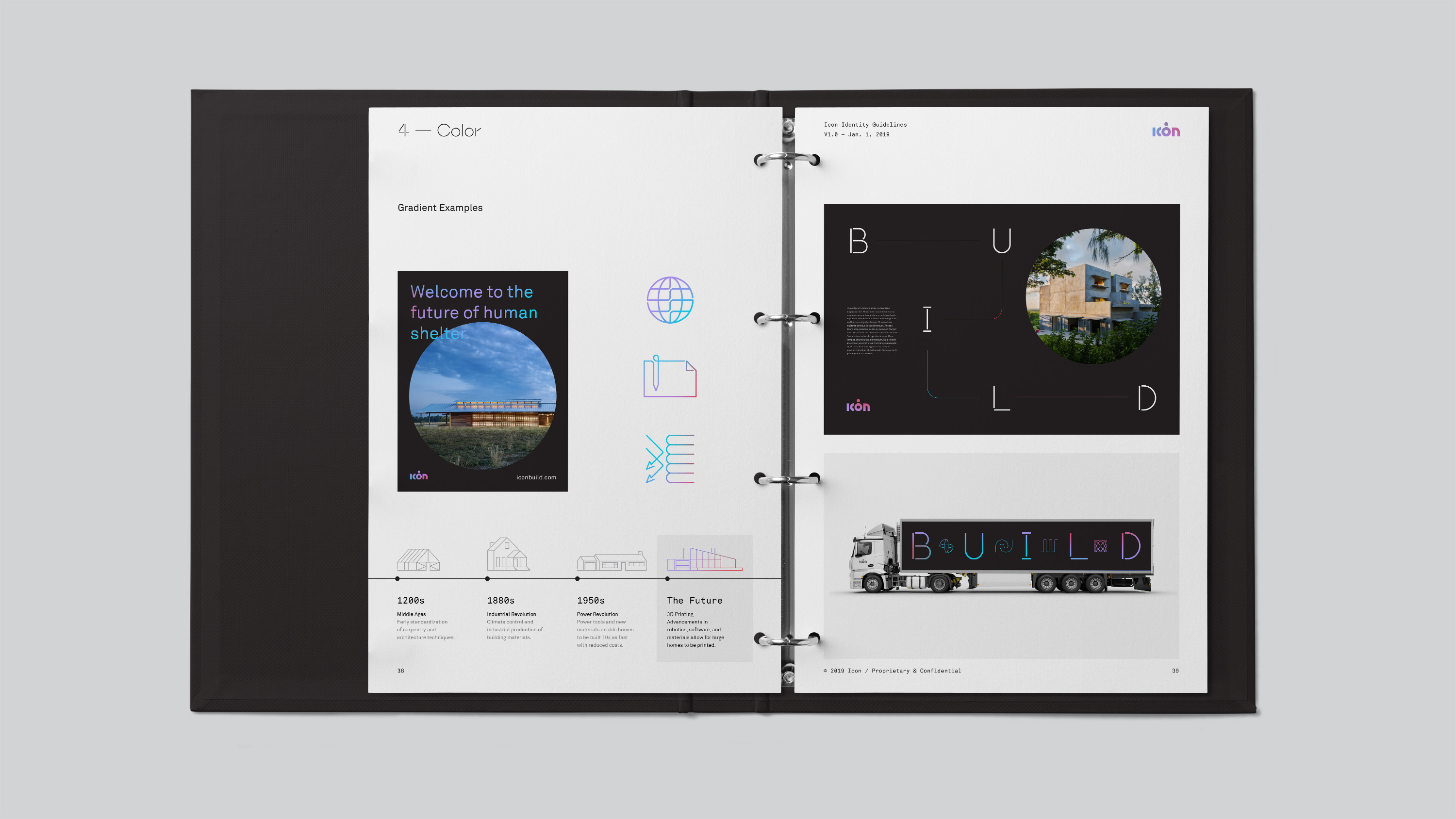ICON is an advanced construction technology company dedicated to revolutionizing homebuilding. Building on the existing logo, the identity system was expanded to include a re-engineered approach to typography, color, iconography, and illustration.Designers: Oscar Morris, Joseph Blalock